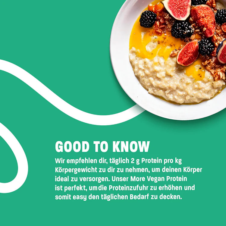 Bei veganem Proteinpulver denkst du direkt an Protein-Shakes mit mehliger Konsistenz, die so gar nicht schmecken? Wir auch. Und genau das wollten wir ändern: Mit sorgfältig ausgewählten, pflanzlichen Proteinquellen erreicht unser More Vegan Protein ein vollständiges Aminosäurenprofil, eine unglaublich cremige Konsistenz und einen unwiderstehlichen Geschmack – im Shake, Porridge, Gebäck und vielem mehr. Für uns bedeutet eine vegane Lebensweise keine Kompromisse einzugehen. Wir sind uns sicher, du wirst unser veganes Proteinpulver lieben, egal, wie du dich ernährst.